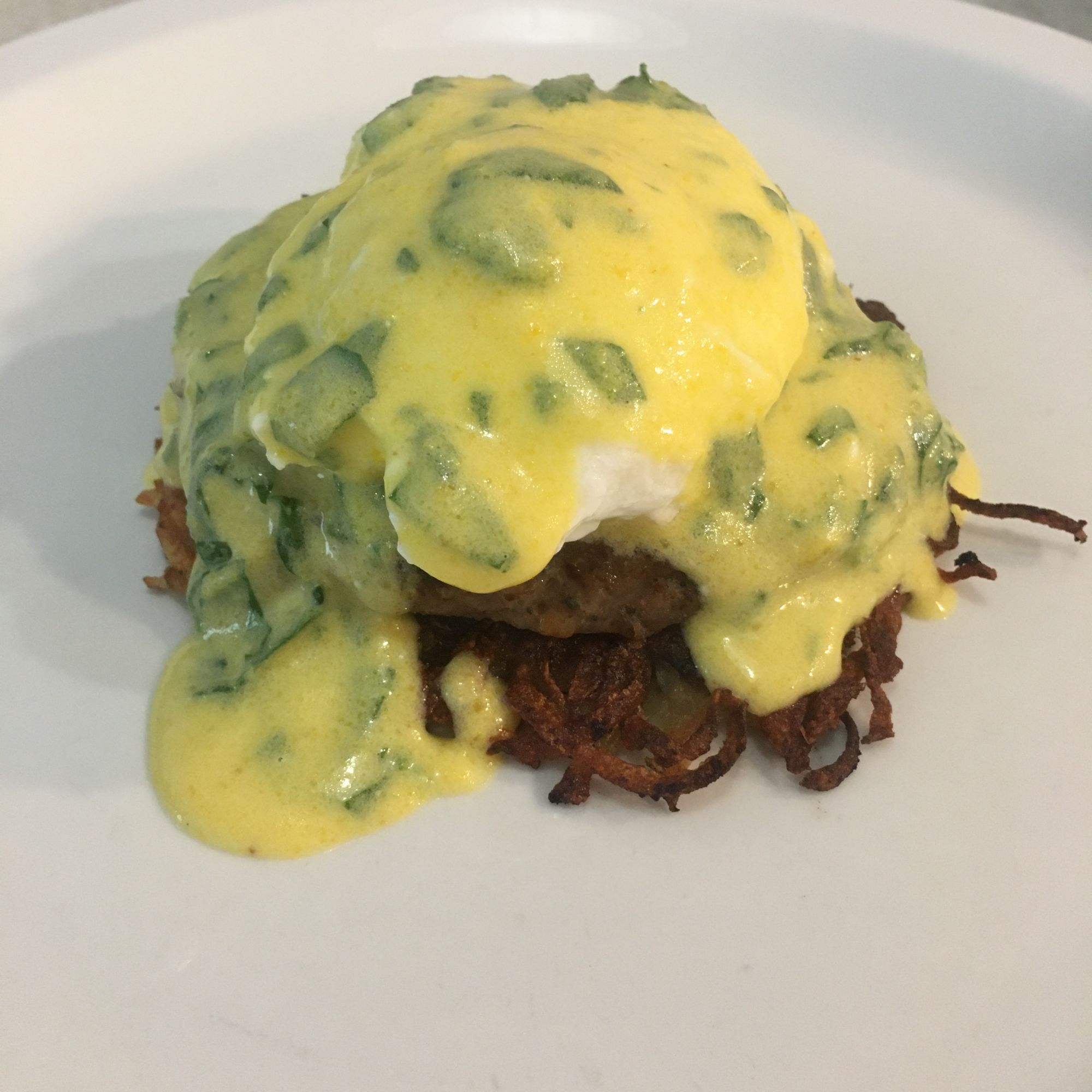 Grate your white potatoes and season with Tony Chachere’s Cajun seasoning. Separate into 4-6 piles and place in a hot skillet. Flatten them out and cook until brown crispy on both sides. This will be the bottom of your Benedict stack .