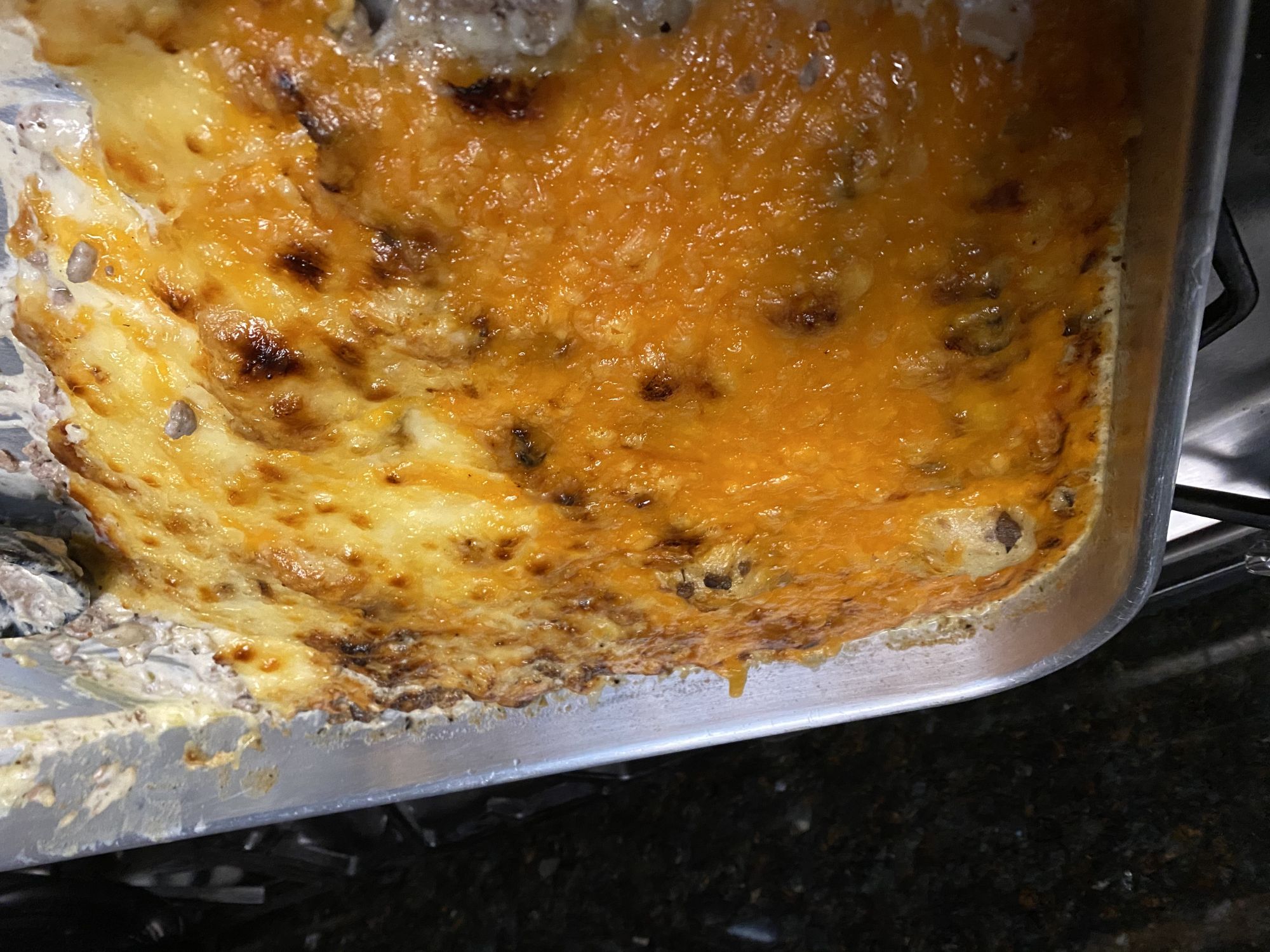 Add the beef mixture and the dumplings to greased 9x13 baking pan. Stir everything together. Top with Swiss Cheese and cover with foil and bake 30 minutes