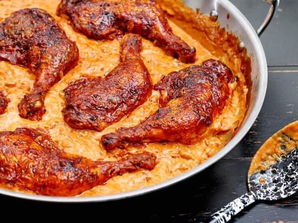 Add tomatoes and broth, whisk until smooth and then nestle the chicken back in the pan, skin-side up. Slide the pan or pot into the oven, and cook until the chicken has cooked through and the sauce has thickened slightly, approximately 25 to 30 minutes.