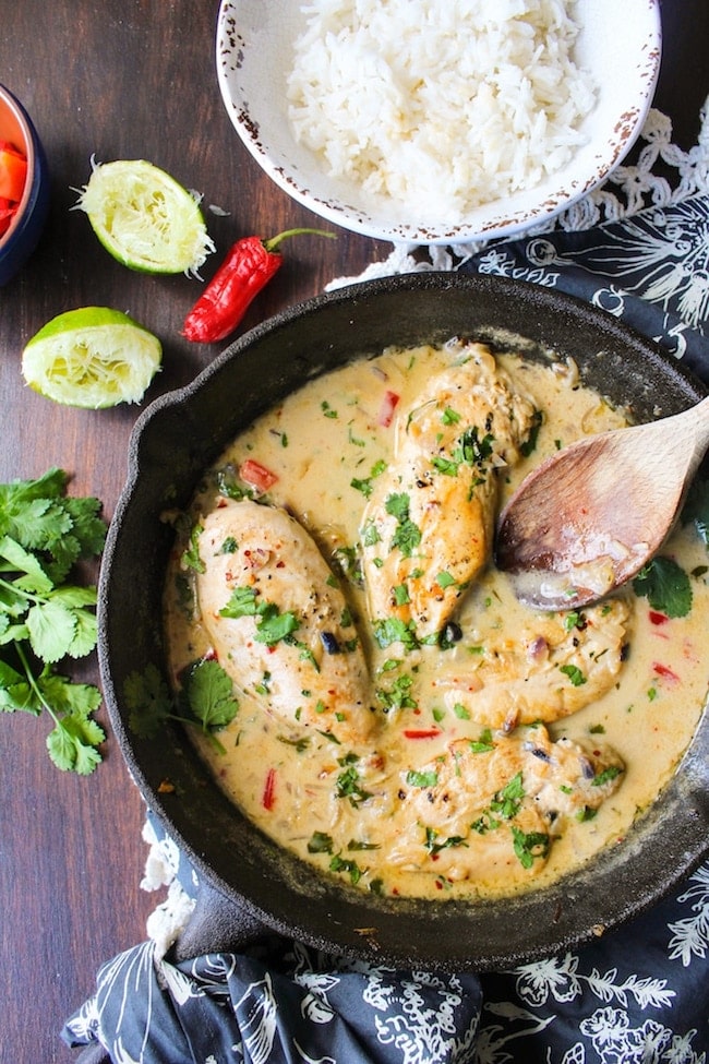 Melt the coconut oil in a large skillet over a medium-high heat. Add the chicken breasts and cook for 5-7 minutes or until browned. Flip over and cook another few minutes to brown the next side. Remove the chicken from a skillet and set aside on a plate. The chicken doesn't need to be fully cooked yet because you'll be returning it to the heat shortly. Wipe down the pan with a paper towel to remove black/brown bits.