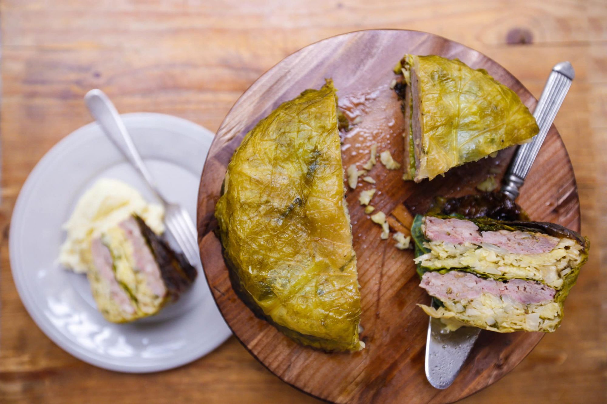 Add half the cabbage and onion mixture to the lined casserole dish and top with half of the sausage, making a solid, even layer and packing the dish down firmly. Add a couple more leaves of cabbage to create another layer, half the core filling and remaining sausage. Press layer down then top with a few more leaves of cabbage to seal filling. Fold in sides of first layer to secure cake and dot the top with butter.