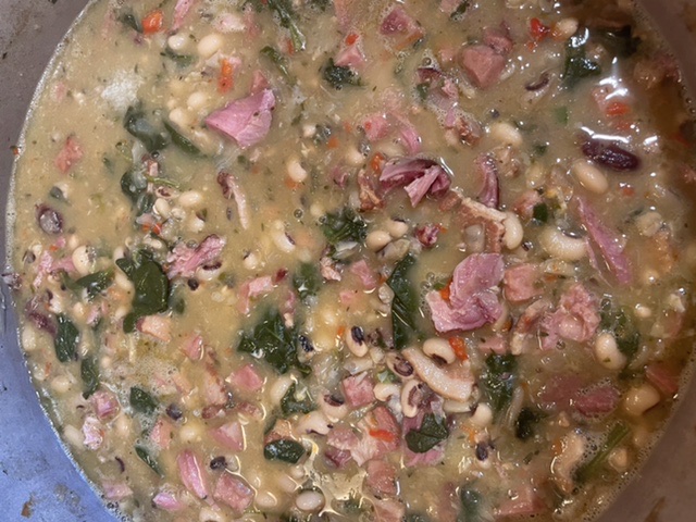 When cooked remove shank and cut meat from it when cool enough to handle and return to pot. Adjust seasoning and serve