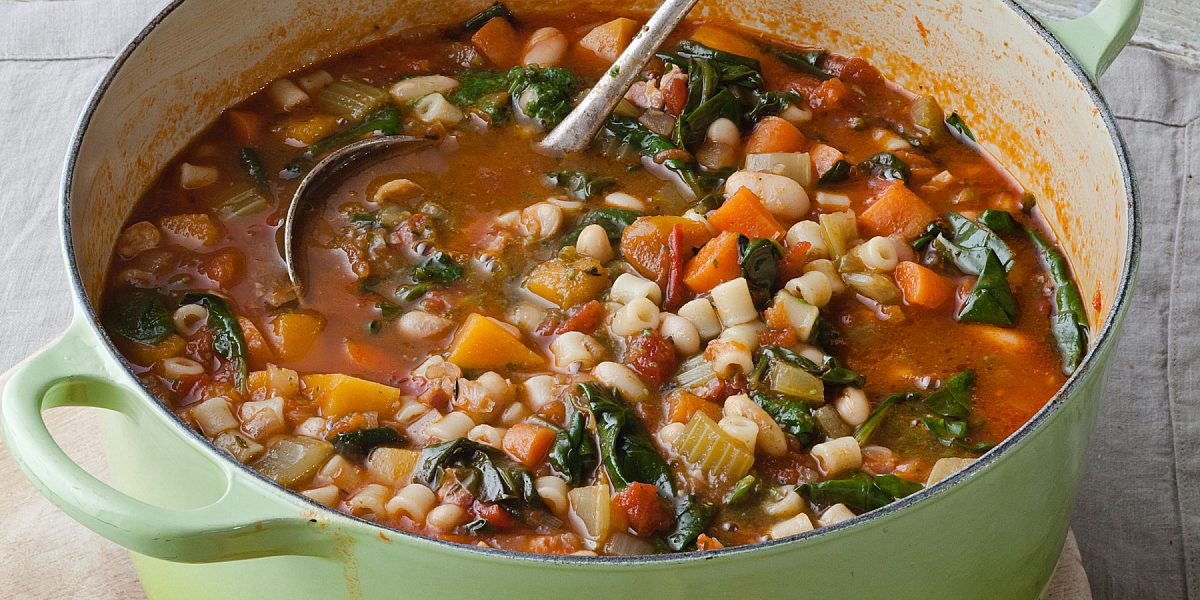 Heat 2 tablespoons of olive oil over medium heat in a large, heavy pot or Dutch oven. Add the pancetta and cook over medium-low heat for 6 to 8 minutes, stirring occasionally, until lightly browned. Add the onions, carrots, celery, squash, garlic, and thyme and cook over medium heat, stirring occasionally, for 8 to 10 minutes, until the vegetables begin to soften.
