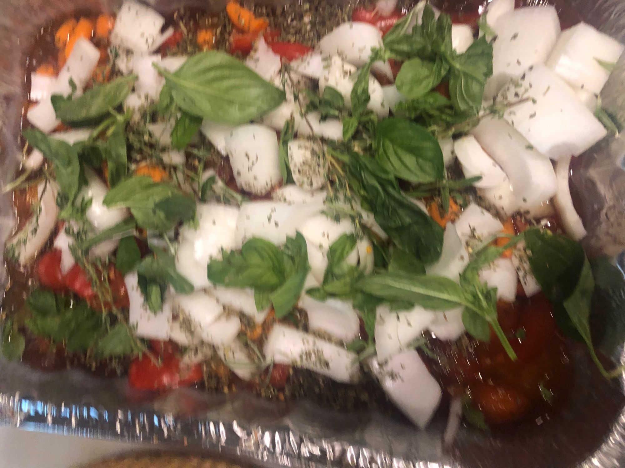 - 2/3 of a 10x14 foil pan of tomatoes (any variety will work I just use whater I have in the garden...usually its a mixture of enough to give me the volume I need; cut to sorta consistent sizes)
