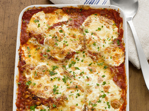 Spread a layer of the tomato sauce in the prepared baking dish. Add the fried mushrooms, then cover with the remaining tomato sauce. Top with the mozzarella and the remaining 1/2 cup parmesan. Bake until browned, 20 to 25 minutes. Sprinkle with the remaining 1 tablespoon parsley.