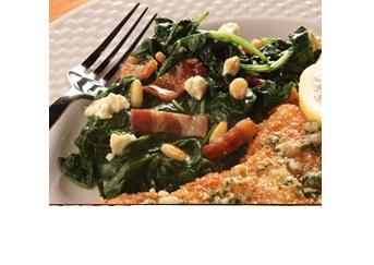 Remove skillet from heat and toss spinach mixture with bacon, feta cheese, and pine nuts. Serve immediately.