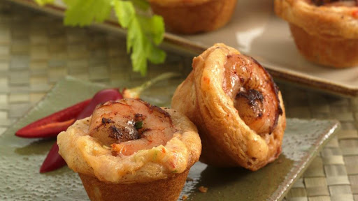 3. In small bowl, mix all remaining ingredients. Spoon scant 1 tablespoon mixture into each dough-lined muffin cup; press in lightly. Top each with 1 shrimp.