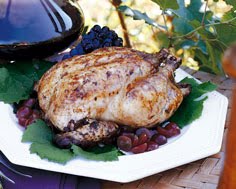 This method of roasting chicken produces a juicy, golden bird with a marvellous sauce. If you use seedless grapes, slice them in half. If the grapes have seeds, slice them in half and flick out the seeds with the point of a knife. The taste and colour of the sauce will change depending on what grapes you use. Serve with crushed red potatoes, French filet beans and garnish with Champagne grapes.