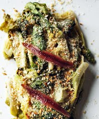 5. In a large mixing bowl, toss the escarole with the dressing. Transfer the escarole to a platter, top with the bread crumbs and anchovies and serve.