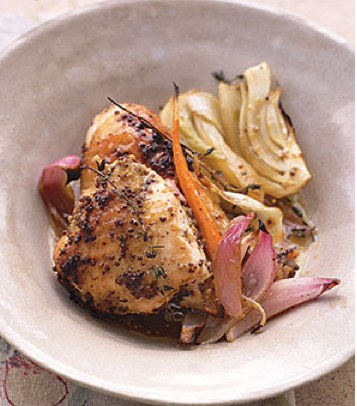 Nestle the chicken among the vegetables. Roast until the chicken is cooked through and the vegetables are tender, 45 to 50 minutes.