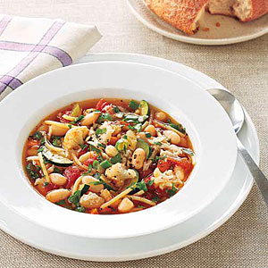 1. Warm oil in a large pot over medium-high heat. Add carrot, onion and celery; cook, stirring often, until softened, 3-5 minutes. Add garlic, saute 1 minute. Pour in broth, increase heat to high and bring to boil. Add both types of beans. Cover, reduce heat to low and simmer 5 minutes.