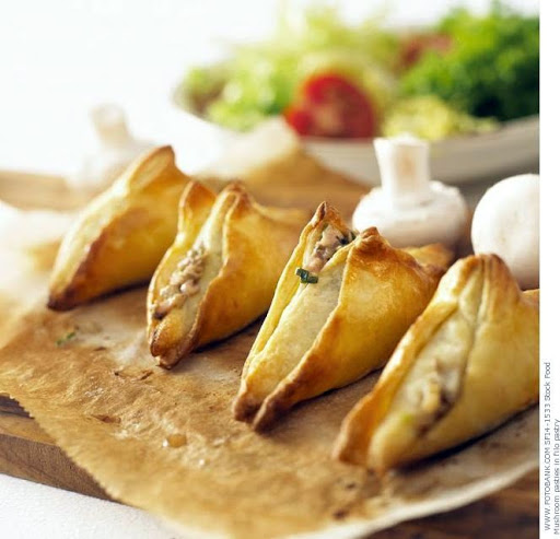 Unwrap the patry one sheet at a time. Keep the rest covered with a damp cloth to prevent drying out. Cut each sheet into strips about 3 x 10 inches long and brush one side only with melted butter. Put one rounded teaspoon of the mixture near the short edge of the buttery side of the first pastry strip - about 1 inch from the bottomand lightly to the left-hand side. Fold the bottom right-hand corner of the pastry diagonally over the filling to make a triangle. Continue folding the pastry at right angles up the whole length of the strip so you end up witha neat little triangular parcel. Make more little pies the same way until all the filling is used up.