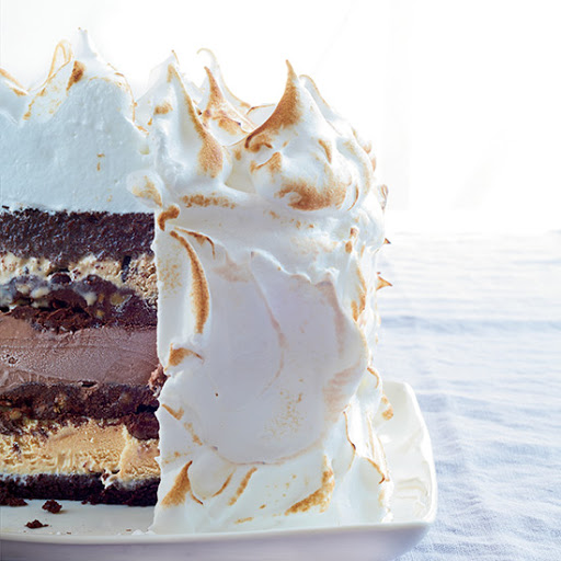 Using a spatula, spread half of the meringue all over the cake. Fill a pastry bag fitted with a plain tip with the remaining meringue and pipe peaks on top. Using a pastry torch, toast the meringue until browned in spots. Return the cake to the freezer for 15 minutes. Cut the cake with a slightly moistened knife and serve right away.
