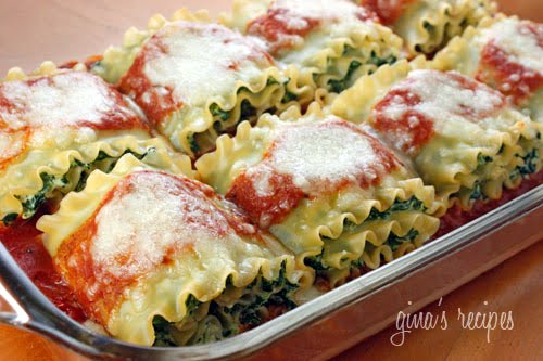 Place a piece of wax paper on the counter and lay out lasagna noodles. Make sure noodles are dry. Take 1/3 cup of ricotta mixture and spread evenly over noodle. Roll carefully and place seam side down onto the baking dish. Repeat with remaining noodles.