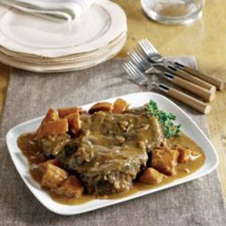 5.Blend water with flour in small cup with wire whisk. Add flour mixture to reserved juices in Dutch oven. Bring to a boil over high heat. Boil, stirring occasionally, 2 minutes. Serve with roast and potatoes.