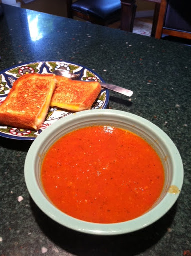 Wash, core, and cut tomatoes in half. Slice onion. Smash garlic. Cover a cookie sheet with aluminum foil and arrange the tomatoes, garlic and onions on top. Generously salt and pepper. Top with a good drizzle of olive oil and roast in the oven for 30-35 minutes. They need to take on a bit of color. Now transfer to a stockpot filled w/ chicken rock and simmer for 20 minutes or until it has reduced by a third. Use and immersion blender( or other blender) to make a smooth texture. Garnish w/ basil leaves.