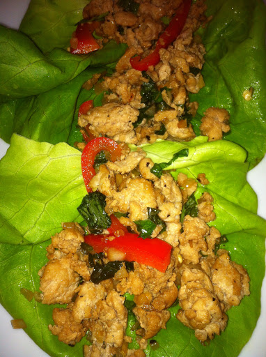 Add remaining 2 tsp oil to pan; swirl to coat. Add chicken; cook 5 minutes or until browned; stirring to crumble.; Drain well. Return chicken to pan over medium heat. Add chilies; cook 1 minute. Add shallot mixture to pan. Stir in fish sauce and next 3 ingredients (through black pepper); cook 1 minute or until thoroughly heated. Remove pan from heat; stir in basil and juice. Serve with lime wedges. Wrap in lettuce leaves, if desired