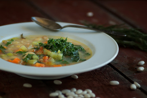 Remove from heat, stir in piment d'Esplette and kale. Cover and allow the kale to wilt in the residual heat of the soup for about 5 minutes. Salt as needed and serve with extra virgin olive oil.