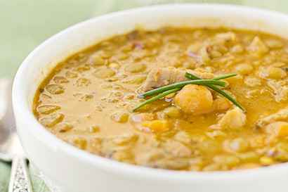 5. Remove the pork chops from the pot. Using two forks, pull the meat from the bones. Discard the bones. Lightly shred the meat and return it to the soup.
