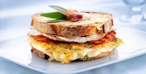 Heat griddle or skillet over medium heat and add butter. Remove dipping mixture from refrigerator. Rewhisk to blend well. Dip the bread slices, one at a time, in mixture. Grill one side. Flip. Brown second side. Top 4 slices each with 1 ounce Brie, a portion of the potatoes, 1 egg, two slices of bacon, and another ounce of Brie. Top with another prepared bread slice. Continue to grill sandwiches briefly to heat the Brie, being careful not to overbrown bread. Serve with maple syrup on the side, if desired.