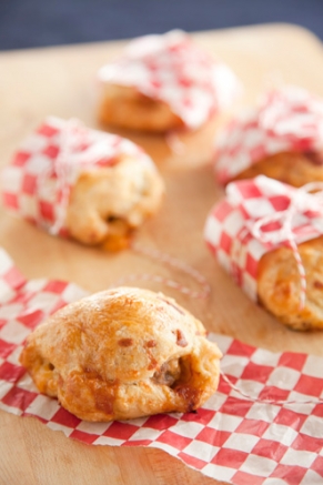 On a lightly floured surface, unfold the pastry and roll out. Cut the pastry lengthwise into 4 equal strips, then cut strips in 1/2 crosswise. Place 1 patty on each strip and top with cheese. Fold the pastry up around the burgers and pinch the edges together to seal, molding to fit around the patties. Brush the tops of the pastries with the egg mixture.