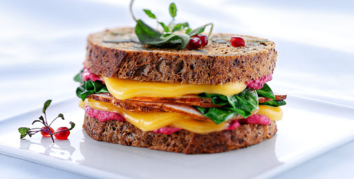 Heat large skillet or sauté pan over medium heat. Spread one side of each bread slice with sage-butter. Place 4 slices butter-side down in pan and spread each with 1 tablespoon cranberry-mustard. Top with 2 slices Gouda, 2 ounces turkey, and 2 ounces spinach. Top with 2 more slices Gouda and bread slice, butter-side up. Grill, turning sandwiches once until bread is golden and cheese is melted. Serve remaining cranberry-mustard on the side.