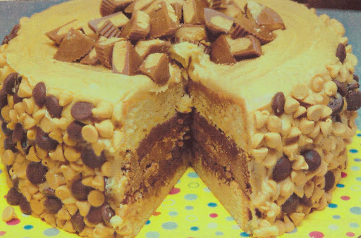 2 PEANUT BUTTER BLONDIE LAYERS, 1 CHOCOLATE CHEESECAKE LAYER FILLED WITH AN INTENSE CHOCOLATE FROSTING, TOPPED WITH PB FROSTING
