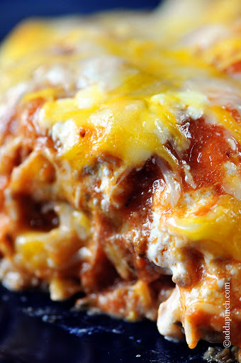 In a rectangular pyrex dish layer two tortillas (dipped in sauce) with meat and cheese. Add two more layers. Pour remaining sauce over casserole and top with cheese.