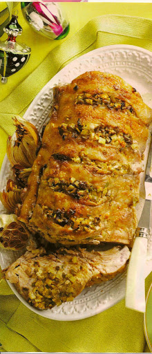 Place roast in a shallow roasting pan, stuffing side up. Roast at 350° for 1-1/2 to 1-3/4 hours or until a thermometer inserted in pork reads 145°. Remove roast from oven; tent with foil. Let stand for 15 minutes before carving.