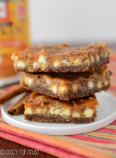 4.Whisk pumpkin, sweetened condensed milk, and pumpkin pie spice in a small bowl or measuring cup and pour over the top of the bars.