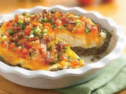 Shepherd's pie with a twist topped with Cheddar cheese before baking, then garnished with green onion, fresh tomato and bacon bits before serving.