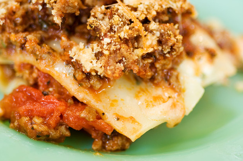 Place sauce in bottom of rectangle pyrex dish. Alternate with wide lasagne noodles,ricotta, mozzarella, sauce, etc finishing with mozzarella.