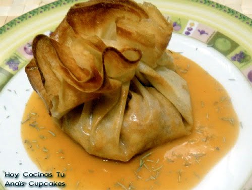 Hacer lo mismo con todos los saquitos y colocarlos en la bandeja de horno forrada con papel. Hornear a 210ºC unos 10-15 minutos.