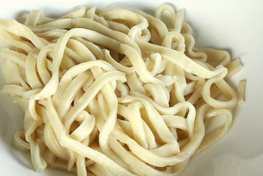 When dry, fold dough several times and slice off folded end to desired width. After noodles are cut, put them a little by little into boiling chicken broth. Stir between each addition so noodles don’t stick.