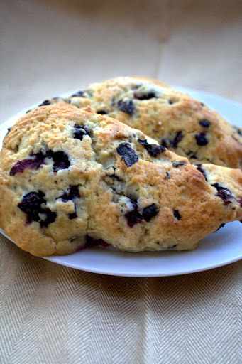 Roll blueberries in flour to coat, this will help prevent the fruit from sinking to the bottom of the scone when baked. Fold the blueberries into batter, being careful not to bruise. Drop large tablespoons of batter on an ungreased cookie sheet.
