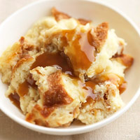 Add the egg yolks and sugar to the cream, then whisk the custard mixture until well combined and uniformly light yellow. Make a layer of bread slices, cutting or tearing slices as needed to fit evenly. Pour about 1/4 of the custard mixture evenly over the bread. Repeat with 3 more layers of bread and custard. The bread may rise a bit above the rim of the pan on the last layer. Pour the remaining custard over it slowly so that you get minimal runoff over the pan’s edge. Fold the foil up over the top. Arrange a plate over the foil and weigh it down with a can of beans or other heavy can from the pantry. Refrigerate for about 1 hour so that the custard soaks through the bread thoroughly. Remove the can and plate.