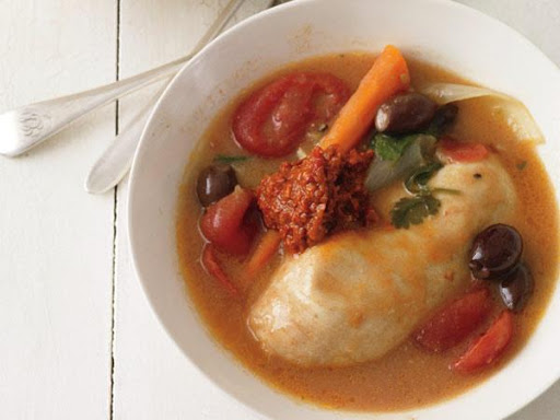 Coat the stoneware of a slow cooker pot with cooking spray. Combine the broth, flour, oil, cumin, pepper, and salt in the pot. Whisk until smooth. Add the tomatoes (with juice), carrot, onion, olives, and garlic. Stir to mix. Tuck the chicken into the pot, covering with the other ingredients. Cover and cook on low for 5 to 6 hours or on high for 3 to 4 hours.