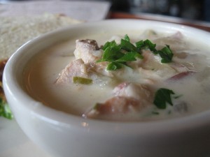 Melt butter in heavy large pot over medium heat. Add salt pork/pancetta and cook until it begins to brown, about 8 minutes. Add onions and bay leaf and sauté until onions soften, about 6 minutes. Stir in flour and cook 2 minutes (do not allow flour to brown). Gradually whisk in reserved juices from clams. Add potato mixture, clams, half and half. Simmer chowder 5 minutes to blend flavors, stirring frequently. Season to taste with salt and pepper. (Can be prepared 1 day ahead. Refrigerate uncovered until cold, then cover and keep refrigerated. Bring to simmer before serving.)