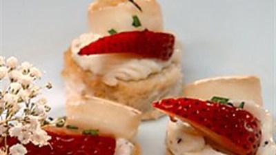 Using a 1 1/2-inch diameter biscuit cutter, cut the sliced bread into 6 circles and put on a baking sheet. Toast the brioche circles in the oven for 3 to 5 minutes, until golden brown. With a rubber spatula, fold together the cream cheese and chopped chives and place in a small pastry bag with star tip. Pipe out about 1/2-ounce of cream cheese and chive mixture onto each toasted brioche circle. Cut off top of strawberry, slice in half lengthwise, then cut each half into 3 wedges. Cut the 1/2 wheel of Brie into 6 triangle wedges. Place 1 wedge of strawberry and 1 wedge of Brie standing up on the cream cheese. Place 1 parsley sprig on top of each.