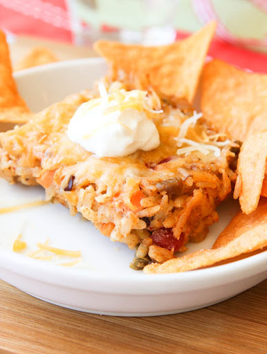 After cooking the rice, combine all the other ingredients with the rice in a large bowl and stir until combined. Pour mixture into a foil-lined 9 x 13 pan. Sprinkle remaining 1/2 shreeded cheese on top. Bake at 375F for approximately 35-40 minutes, or until cheese and the top is beginning to brown. If you added extra beans, veggies, or your salsa was watery, this could lengthen cooking time.