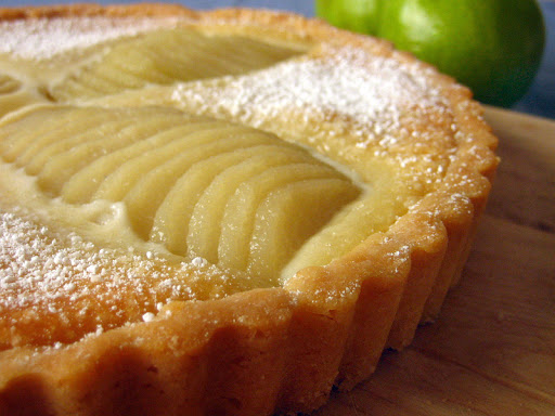 8. Rub apricot jam through a wire strainer into a small pan; heat over low heat until melted. Let cool for 5 minutes. Lightly brush or drizzle jam over pears and filling. Cover loosely with foil and refrigerate. Before serving, remove pan rim and distribute almonds around pears.