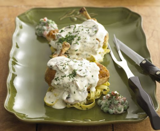 Pound chicken breasts to 1/4" thickness. Place 2 tbsp. rondelé cheese in center of breast and roll. Dredge with flour. Mix eggs with parmesan cheese to make a batter. Dip flour-coated chicken in cheese and egg mixture. Heat vegetable oil in skillet and sauté chicken at medium heat until golden brown. Place chicken breasts in baking dish over buttered noodles. Melt butter in skillet after draining vegetable oil. Add garlic and scallions. Mix and pour over chicken breasts and noodles. Bake 30 minutes at 375° F.