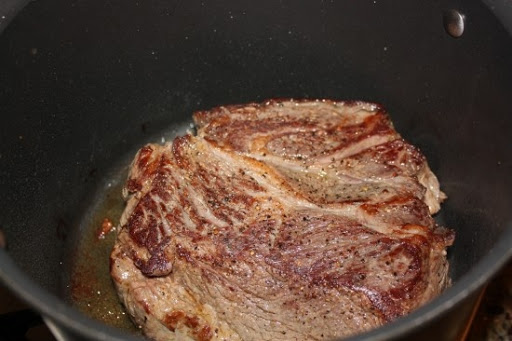Brown roast in oil in a skillet. Place browned roast on top of the vegetables.