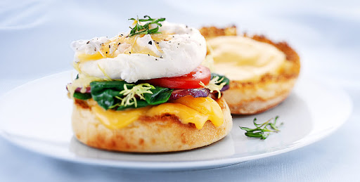 Meanwhile, heat griddle or skillet over medium heat; fry Canadian bacon until lightly browned. Remove from griddle; set bacon aside. Add 1 tablespoon butter to skillet. Spread each bottom half of English muffins with 1 tablespoon Sharp Cheddar cheese spread. Place in heated skillet. Top each bottom in pan with 1 slice Gouda, about 1 ounce spinach, 2 slices Canadian bacon, and 1 slice tomato. Cook over medium heat until cheese is melted. Remove to a plate and top each with a poached egg. Serve open-faced with remaining muffin halves, toasted and buttered, on the side.