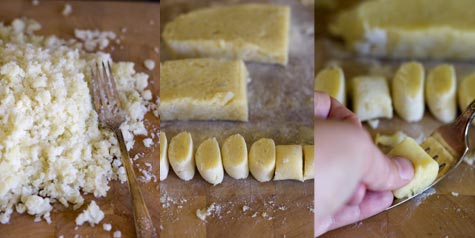 To shape the gnocchi hold a fork in one hand (see photo) and place a gnocchi pillow against the tines of the fork, cut ends out. With confidence and an assertive (but light) touch, use your thumb and press in and down the length of the fork. The gnocchi should curl into a slight "C" shape, their backs will capture the impression of the tines as tiny ridges (good for catching sauce later). Set each gnocchi aside, dust with a bit more flour if needed, until you are ready to boil them. This step takes some practice, don't get discouraged, once you get the hang of it it's easy.