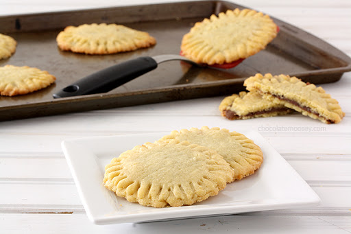4.On one cookie, add 1 teaspoon Nutella in the middle then top with another cookie. Using a fork dipped in flour, seal the edge with a fork. Bake 12-15 minutes or until golden brown on the edges.