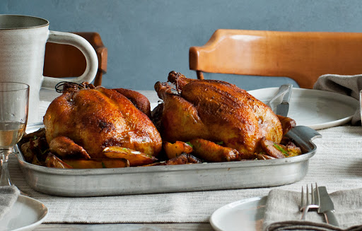 Generously seasoned birds sit overnight, then get a high-heat roasting on a baking sheet, spaced apart so air can circulate around them, crisping the skins.