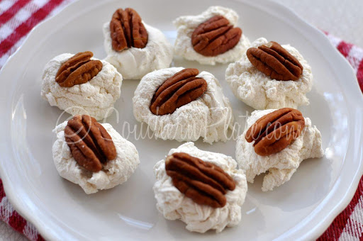 8.Quickly drop by spoonful onto waxed paper. Once it's all dropped onto the paper, quickly shape into smoother balls with clean hands. Press a pecan half into the top of each one, if desired. Press them down pretty good or they'll fall off later.