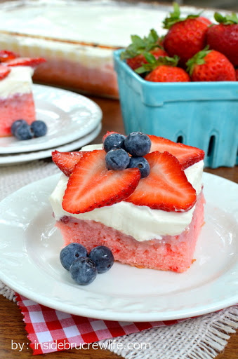 1.Mix the strawberry cake according to the back of the package. Bake in a 9x13 pan for about 28 minutes. Cool for 3-4 minutes and then poke the top of the cake with a fork or with the end of a wooden spoon handle.