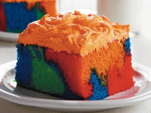 1.Preheat oven to 350°F. Spray bottom only of 13x9-inch pan with cooking spray. In large bowl, beat cake mix, water, oil and eggs with electric mixer on low speed 30 seconds. Beat on medium speed 2 minutes, scraping bowl occasionally. Divide batter evenly among 4 medium bowls. Add a different food color to each bowl to make orange, red, blue and green. Drop by large spoonfuls into pan side by side, alternating colors.